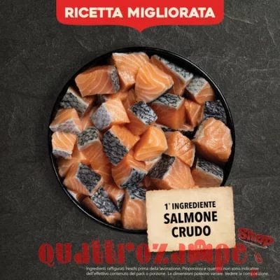 COMPOSIZIONE: Salmone crudo (22%), sardina oceanica disidratata (19%), orzo perlato, piselli interi, avena decorticata, grasso di maiale (8%), avena intera, fibra di ceci, olio di pesce (1%), carbonato di calcio, cloruro di potassio, alga Kelp disidratata, sale, radice di cicoria disidratata, zucca intera fresca, zucca Popone intera fresca, carote intere fresche, mele intere fresche, pere intere fresche, zucchina intera fresca, cavolo riccio fresco, spinaci freschi, cime di rapa fresche, foglie di barbabietola fresche, mirtilli rossi interi, mirtilli interi, bacche Saskatoon intere, curcuma, cardo mariano, radice di bardana, lavanda, radice di altea, bacche di rosa.