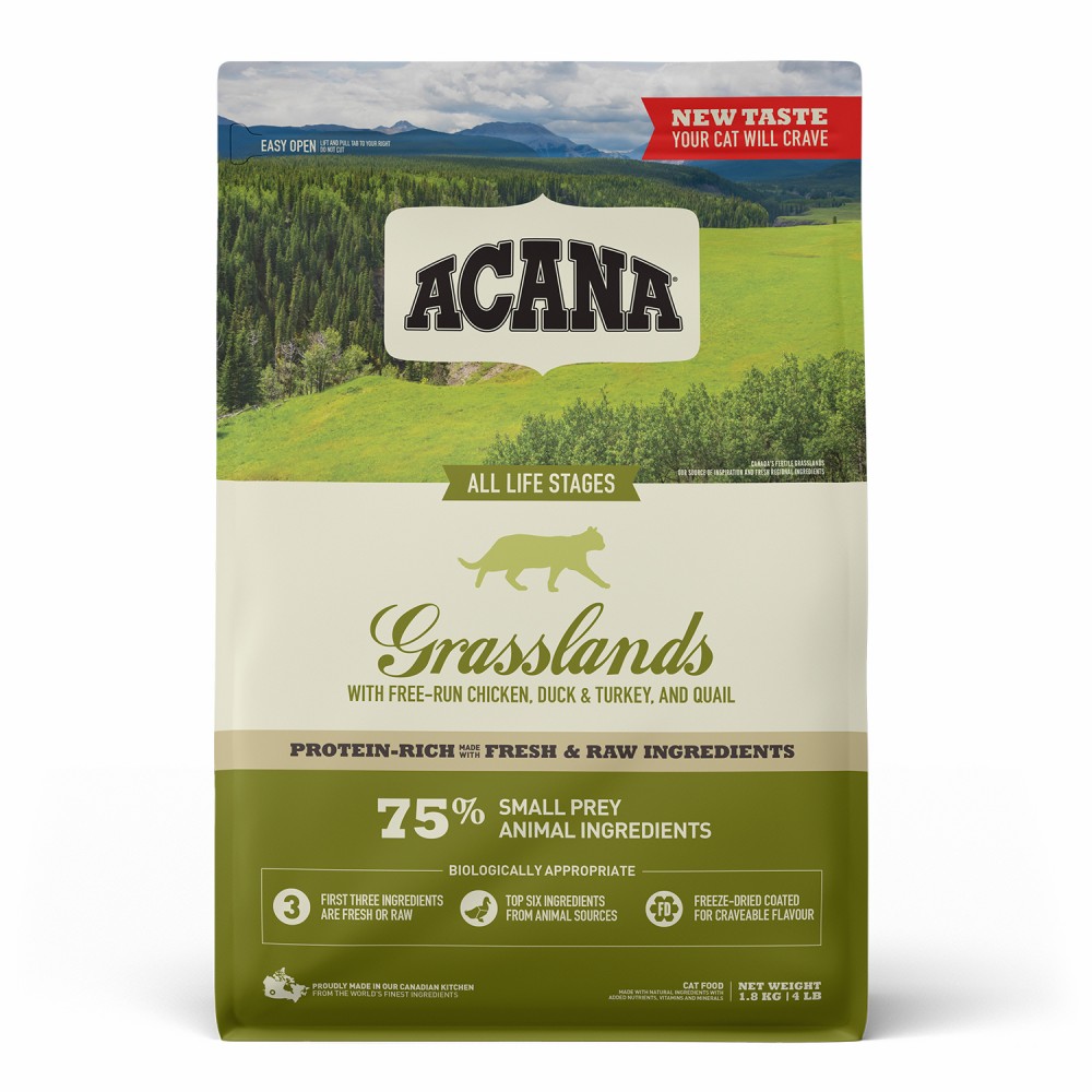 Acana Grasslands è un cibo secco di qualità Premium per gatti e gattini di tutte le razze ed età. Non soltanto la varietà delle proteine animali, dei componenti vegetali delle vitamine e dei nutrienti è importantissima, ma ciò che veramente conta è l' altissima qualità delle materie prime utilizzate.