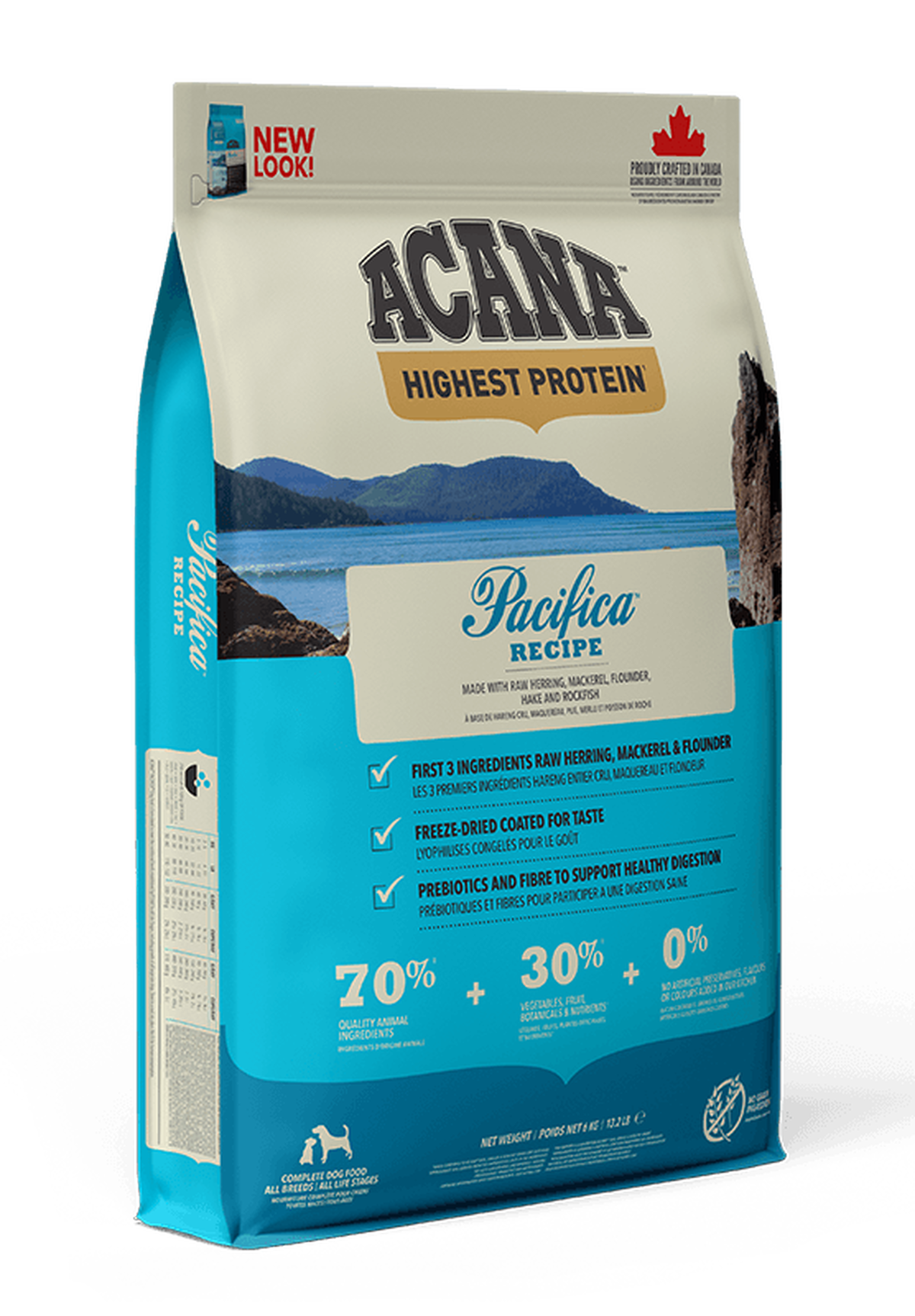 Riflettendo il ricco raccolto marittima dal freddo e incontaminate acque del Pacifico del Canada, ACANA Pacifica ? caricato con pesce fresco e regionale canadese, selvaggio e sostenibile catturato al largo del Nord Vancouver Island.