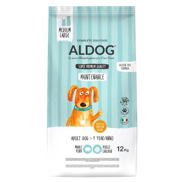 Aldog Super premium Adult All Breeds Maintenance è l'alimento completo adatto a cani adulti di tutte le razze. Crocchette multi proteiche ricche di maiale, manzo e pollo. Crocchette per cani che favoriscono all’equilibrio della flora batterica e la produzione di feci solide e compatte.