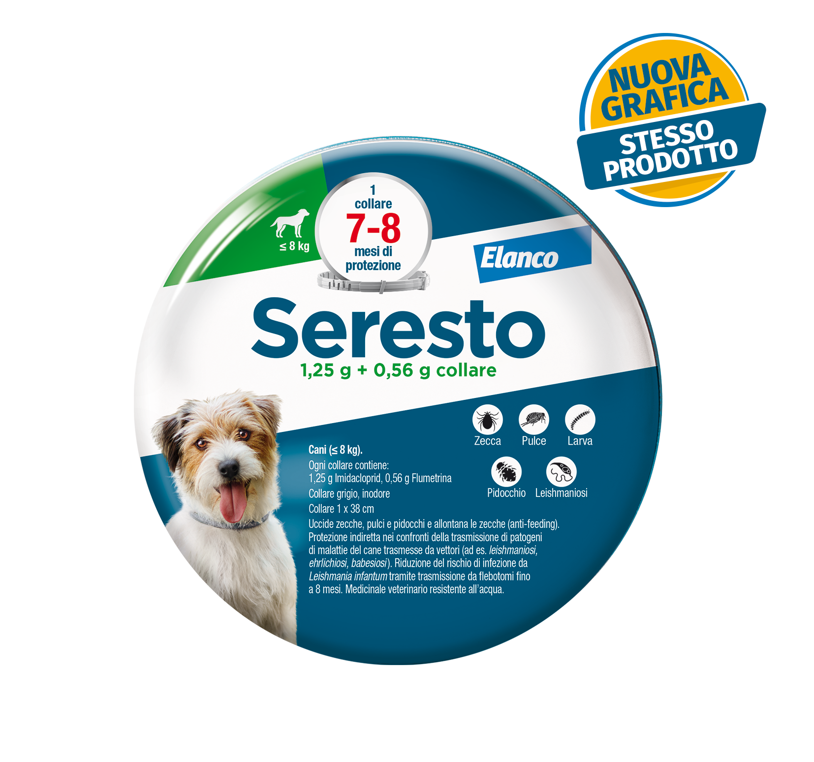 collare antiparassitario per cani meno di 8 kg, lo utilizzo per 7 mesi. Collare grigio, arrivato dentro alla confezione metallica, ora il prodotto viene prodotto dall'elanco. Bayer ha venduto il suo marchio per la linea pet.