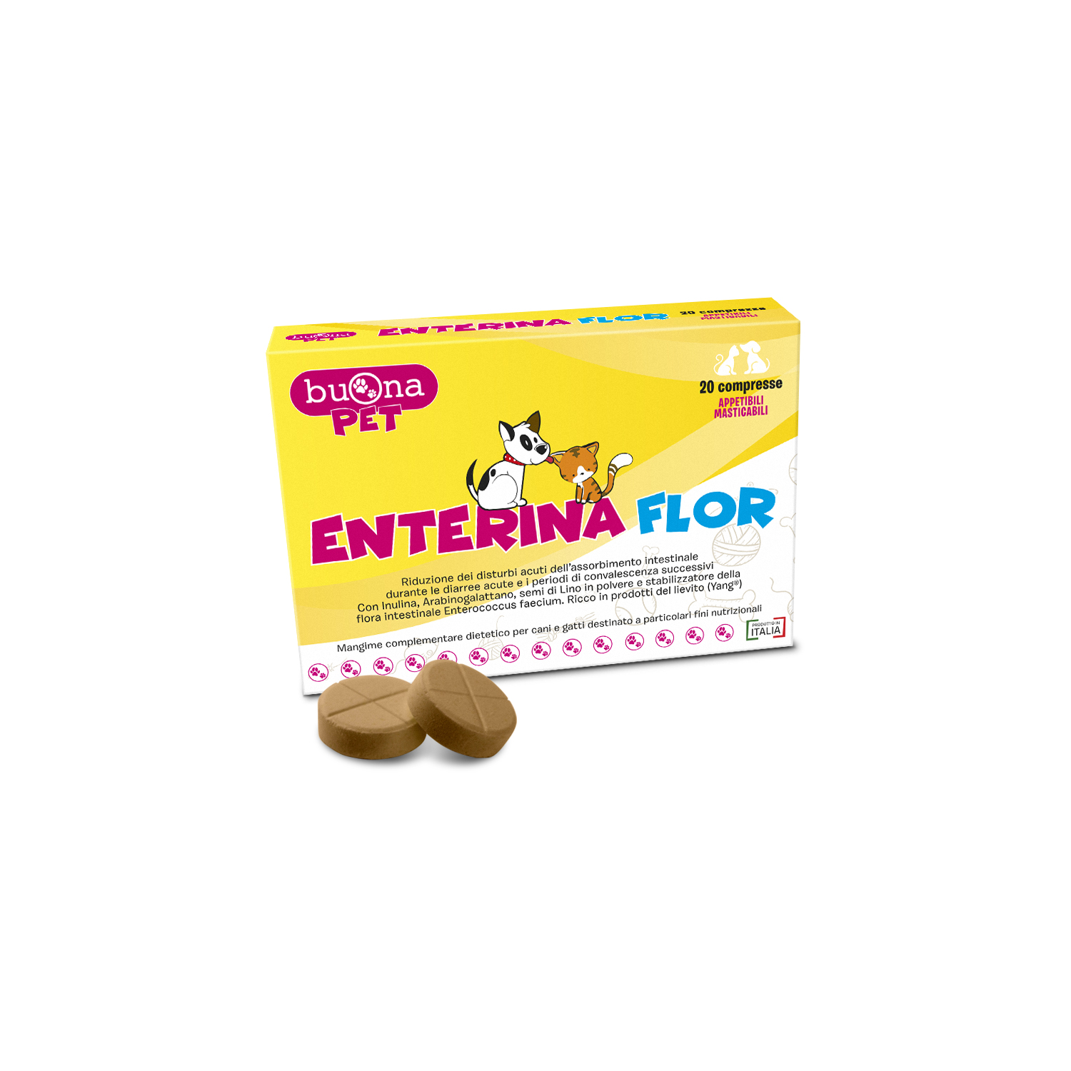 ENTERINA FLOR e` un mangime complementare dietetico per cani e gatti destinato a particolari fini nutrizionali per la riduzione dei disturbi acuti dell’assorbimento intestinale, utile complemento durante le diarree acute e i periodi di convalescenza successivi.