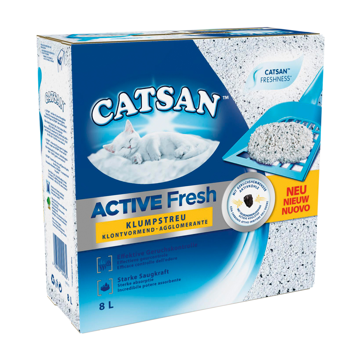 Lettiera agglomerante Catsan Active Fresh per gatti profumata, bianca naturale, controlla gli odori grazie al carbone attivo nero, forte potere assorbente, povera di polvere. Igienica e fresca.