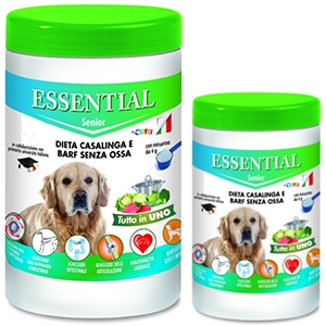 Caratteristiche: ESSENTIAL Cane Senior è l’alimento complementare, essenziale per l’integrazione della dieta casalinga, a eliminazione, o BARF senza ossa del cane anziano.
