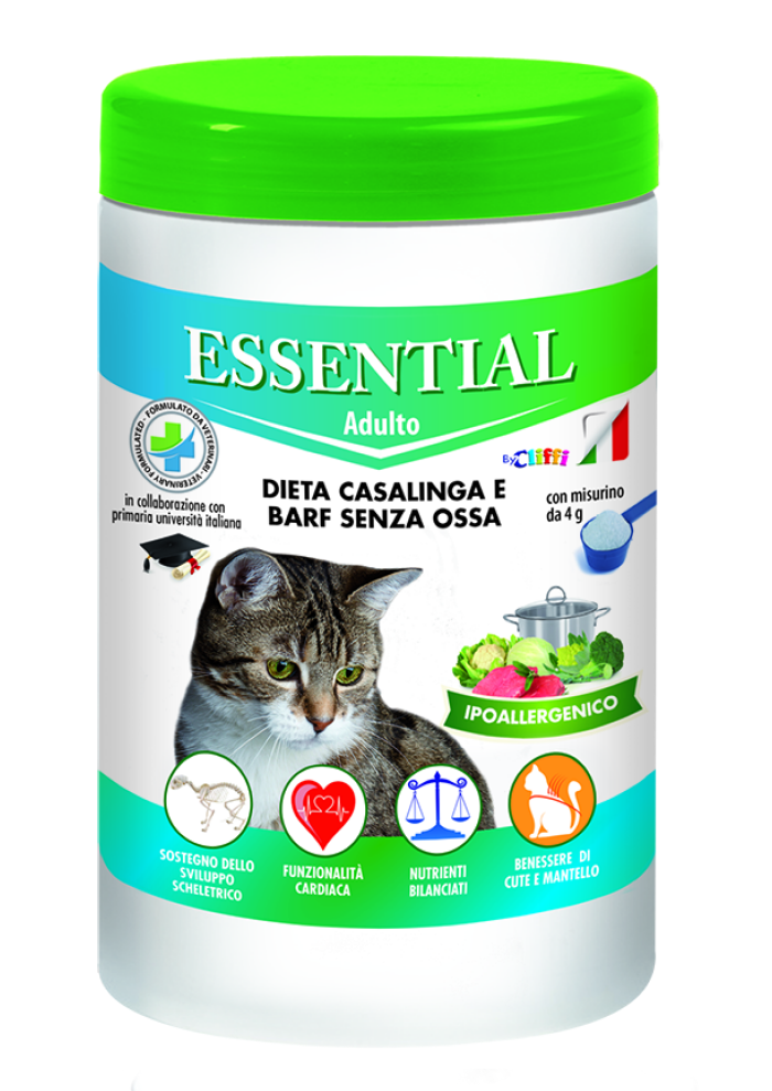Caratteristiche: ESSENTIAL Gatto Adulto è l’alimento complementare, essenziale per l’integrazione della dieta casalinga, a eliminazione, o BARF senza ossa del gatto adulto. La presenza dei macroelementi minerali (calcio, fosforo, magnesio, cloro, sodio e potassio), degli oligoelementi minerali (zinco, ferro, rame, manganese, selenio e iodio) e di tutte le vitamine è stata attentamente ponderata tenendo conto delle carenze tipiche delle diete casalinghe tradizionali. L’elevato apporto di nutrienti antiossidanti (vitamine E e C, taurina) contribuisce alla buona funzionalità del sistema immunitario. Il corretto bilanciamento di calcio, fosforo e vitamina D contribuisce alla salute dell’apparato scheletrico. Il giusto apporto di Taurina, essenziale nella specie felina, contribuisce alla corretta funzionalità del cuore e della retina. ESSENTIAL Gatto Adulto è a ridotto potere allergizzante, poiché contiene solamente proteine idrolizzate. Tutti gli integratori ESSENTIAL sono stati formulati in collaborazione con docenti di nutrizione del cane e del gatto presso primarie università italiane.