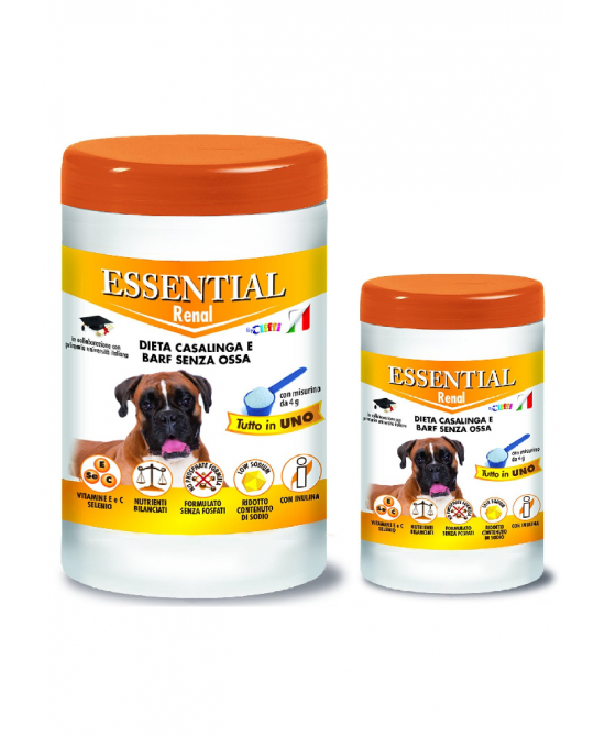 Caratteristiche: ESSENTIAL Cane Renal è l’alimento complementare, essenziale per l’integrazione della dieta casalinga, a eliminazione, o BARF senza ossa del cane adulto, ideale per favorirne la corretta funzionalità renale (che necessiti di un sostegno della funzionalità renale). La vitamina E, la vitamina C e il selenio contrastano lo stress ossidativo grazie alla loro funzione antiossidante. L’inulina, riducendo l’assorbimento di scorie azotate dall' intestino, è utile per migliorare il controllo dell’azotemia. Formulato senza fosforo, con limitato apporto di sodio, e con citrato di potassio, favorisce il mantenimento di un corretto equilibrio elettrolitico,acido-basico e delle normali condizioni metaboliche. Contiene vitamine, macroelementi e oligoelementi minerali, normalmente carenti nelle diete casalinghe. I nutrienti antiossidanti supportano il sistema immunitario; il corretto apporto di calcio e di vitamina D contribuisce al benessere dell’apparato scheletrico, evitando i rischi di carenze o di possibili eccessi. Ad elevata tollerabilità, poiché è formulato senza fonti proteiche aggiunte