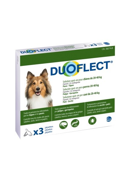 Duoflect è una soluzione spot on per cani dai 20 ai 40 kg contro pulci e zecche ed ognuna delle 3 pipette contiene 2,82 ml di prodotto.