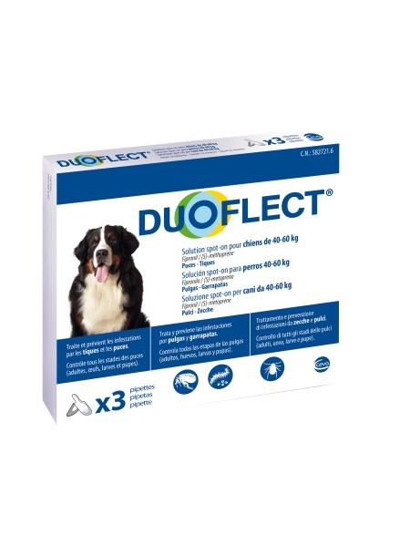 Duoflect è una soluzione spot on per cani dai 40 ai 60 kg contro pulci e zecche ed ognuna delle 3 pipette contiene 4,24 ml di prodotto.
