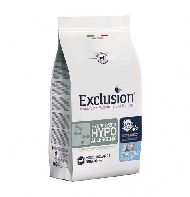 Exclusion Monoprotein Veterinary Diet Formula Hydrolyzed Hypoallergenic u00e8 un alimento dietetico con formulazione monoproteica, realizzato con un'unica fonte alternativa di proteine animali idrolizzate a basso peso molecolare, una fonte selezionata di carboidrati e preservato con tocoferoli naturali; rappresenta la risposta nutrizionale a disposizione del Veterinario, differenziata per taglia, come supporto nutrizionale specifico per cani con intolleranze alimentari.