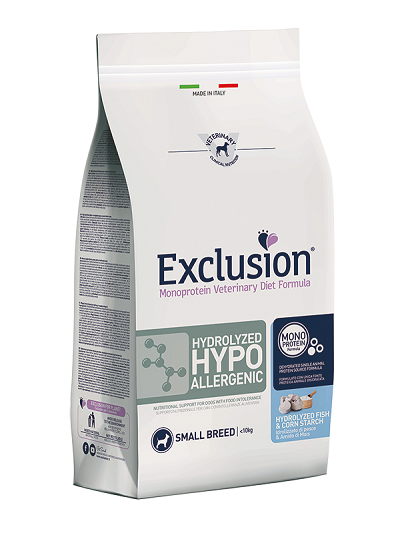 Exclusion Monoprotein Veterinary Diet Formula Hydrolyzed Hypoallergenic u00e8 un alimento dietetico con formulazione monoproteica, realizzato con un'unica fonte alternativa di proteine animali idrolizzate a basso peso molecolare, una fonte selezionata di carboidrati e preservato con tocoferoli naturali; rappresenta la risposta nutrizionale a disposizione del Veterinario, differenziata per taglia, come supporto nutrizionale specifico per cani con intolleranze alimentari.