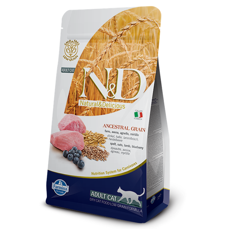 Farmina n&d low grain gatto farro avena agnello e mirtillo è un alimento completo per gatti adulti a base di farro, avena, agnello, mirtillo.
