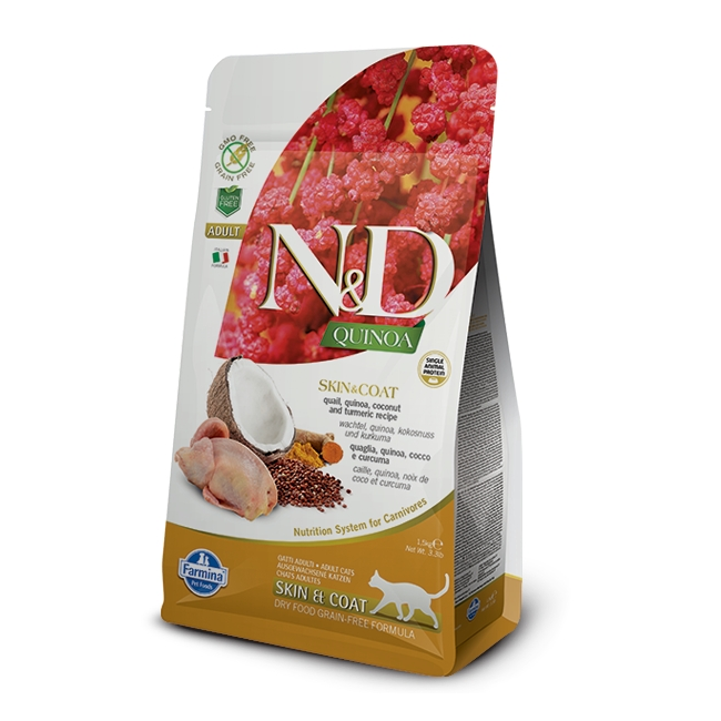 Farmina n&d quinoa gatto skin&coat quaglia è un alimento completo per gatti adulti a base di quaglia, quinoa, cocco e curcuma. Una formula speciale per intolleranze alimentare, utile per ripristinare e mantenere la pelle e il benessere del pelo.