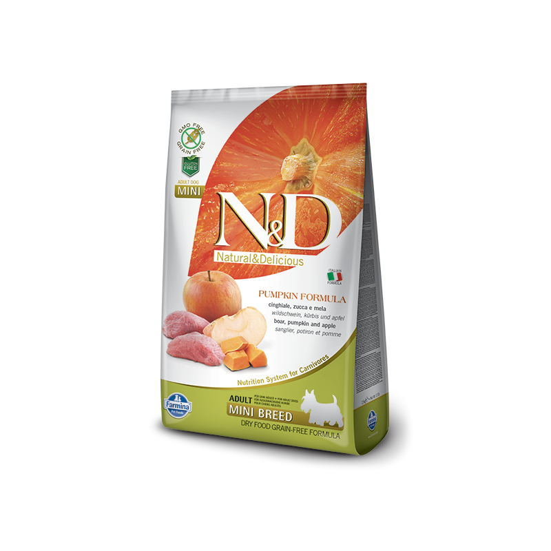 Farmina n&d pumpkin grain free adult mini cinghiale zucca e mela 7 kg è un alimento completo per cani adulti a base di cinghiale, zucca e mela.