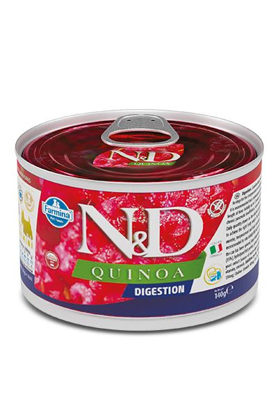 N&D Quinoa Digestion ? un alimento dietetico completo per cani, consigliato per la compensazione della cattiva digestione e dell'insufficienza pancreatica esocrina.