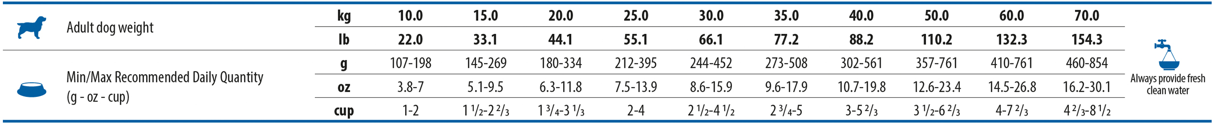 Proteina grezza 24.00%, Grassi grezzi 12.00%, Fibre grezze 2.90% Umidità 9.00%, Ceneri grezze 7.30%,Calcio 0.90%, Fosforo 0.80%, Omega‐6 1.40%, Omega‐3 1.50%, Dha 0.60%, Epa 0.40%, Glucosamina 1000mg/kg, Solfato di condroitina 700mg/kg