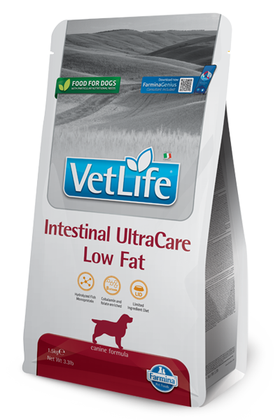 Farmina Vet Life Intestinal UltraCare Low Fat è un alimento dietetico completo, per cani, per la riduzione dei disturbi dell’assorbimento intestinale; compensazione della cattiva digestione, insufficienza pancreatica esocrina.