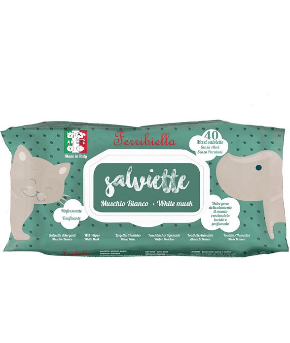 Salviettine detergenti al muschio bianco rinfrescano e tonificano delicatamente il manto di cani e gattiComode, pratiche, rinfrescano e tonificano.Formula rinfrescante e tonificante, detergono delicatamente il manto rendendolo lucido e profumato.Ogni confezione contiene: 40 maxi salviettineSenza alcol e parabeniMarca: Ferribiella
