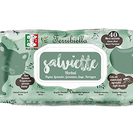 Salviette detergenti Herbal per cani e gatti Salviettine detergenti senza alcol e senza parabeni, ricche di oli essenziali sgraditi agli insetti, con timo lavanda dragonello geranio e salvia .Comode e pratiche per l' igiene fuori casa.Ogni confezione contiene: 40 maxi salviettineSenza alcol e parabeniMarca: Ferribiella