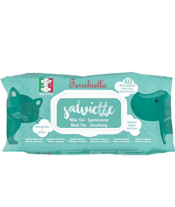 Salviettine mille usi igenizzanti, antibatteriche e lenitive per cani e gattiComode e pratiche per l' igiene fuori casa.Ogni confezione contiene: 40 maxi salviettineSenza alcol e parabeniMarca: Ferribiella