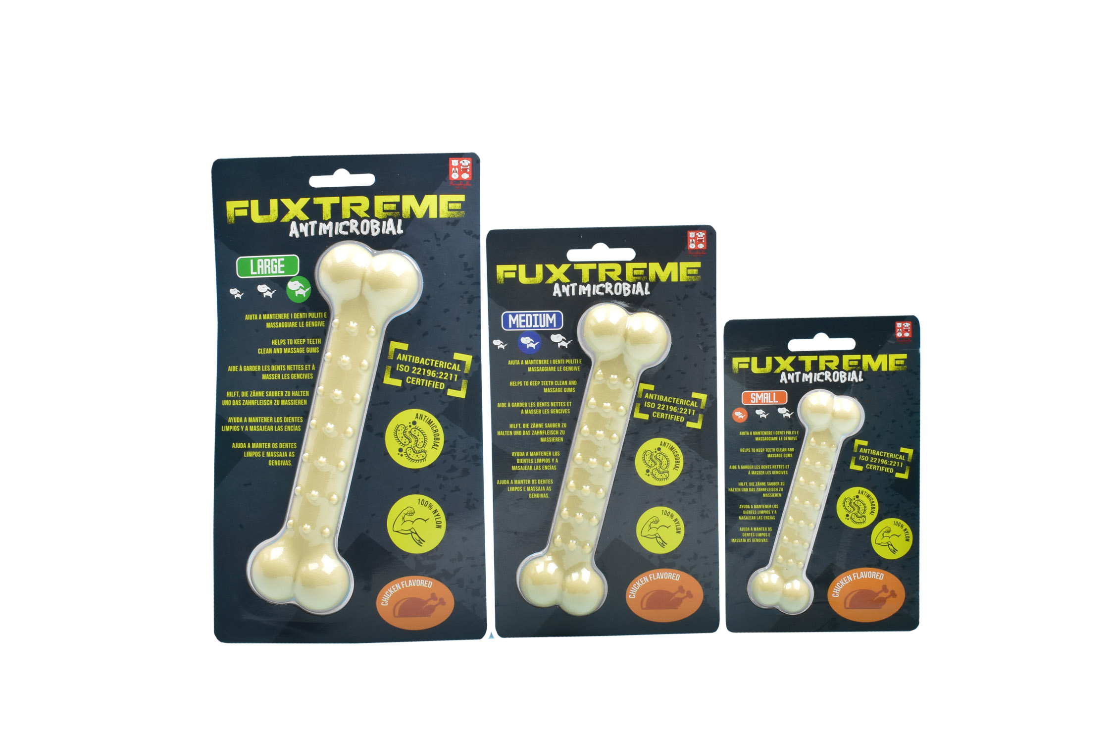Antimicrobial. Un antimicrobico ? un agente che uccide microrganismi e resetta la crescita di batteri, muffe e funghi, le additivazioni antimicrobiche sono incorporate nel giocattolo durante la fabbricazione e durano per la durata prevista del giocattolo, E' stato dimostrato che questo giocattolo da masticazione nylon antimicrobic ha raggiunto un' efficacia del 99,9%.