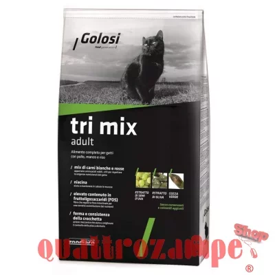 Golosi trimix è la soluzione nutrizionale ideale per il gatto adulto: il mix di pollo e manzo rende l’alimento particolarmente appetibile, apporta proteine a elevato valore biologico e aminoacidi, utili per un buon tono muscolare. Gli omega 3-6 e lo zinco sono validi alleati per pelle e manto, mentre il selenio contribuisce a prote