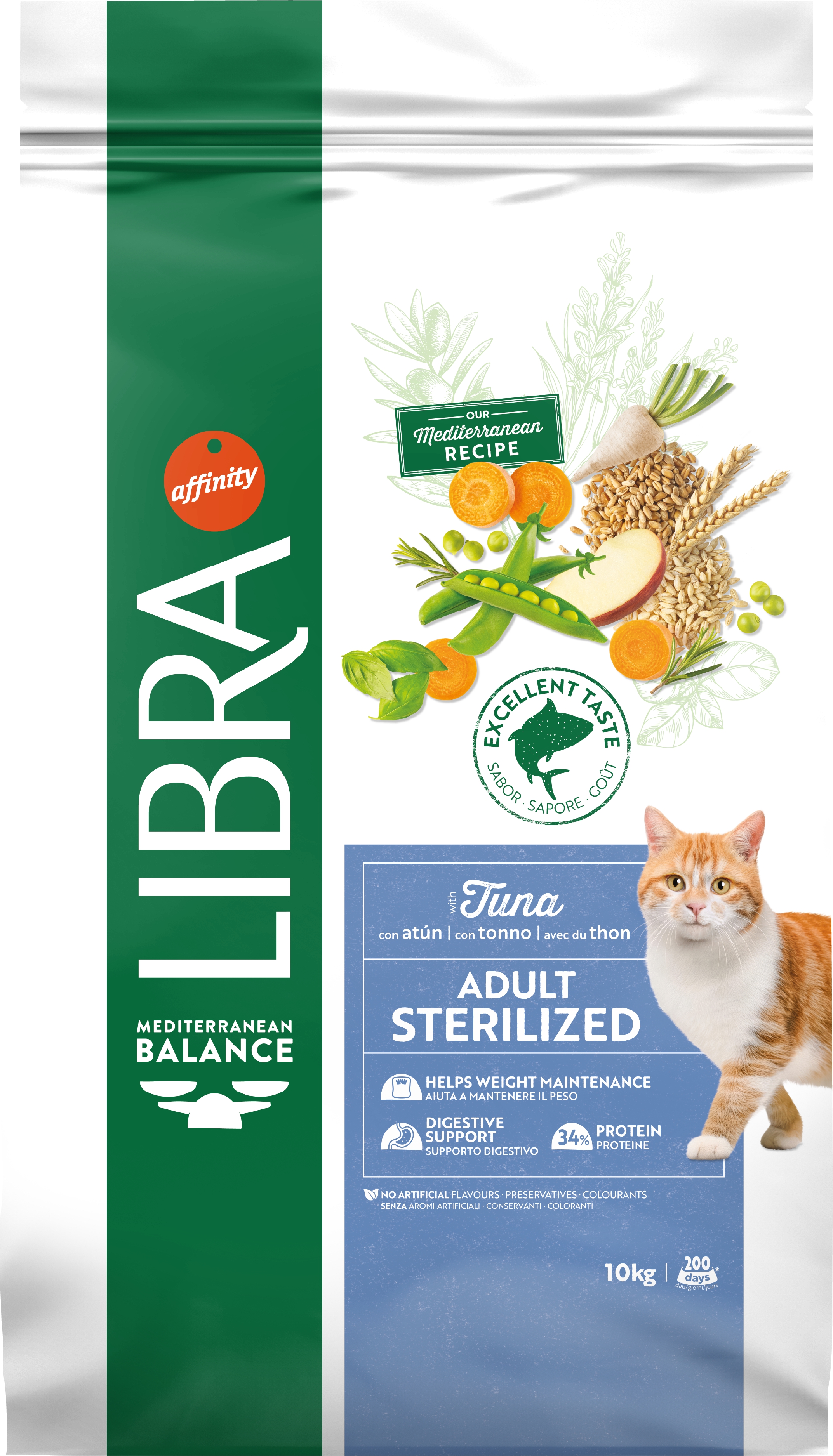 Cereali (orzo integrale 4%, frumento integrale 4%), carni e derivati, estratti di proteine vegetali, pesci e sottoprodotti dei pesci (proteine disidratate di tonno 10%), ortaggi (piselli disidratati 4%, carote disidratate 0,5%, pari al 4% di carote fresche), sottoprodotti di origine vegetale (polpa di barbabietola 1,5%), oli e grassi, sostanze minerali, frutta (mela disidratata 0,3%, pari al 2% di mela fresca), rosmarino disidratato 0,01%, basilico disidratato 0,01%.