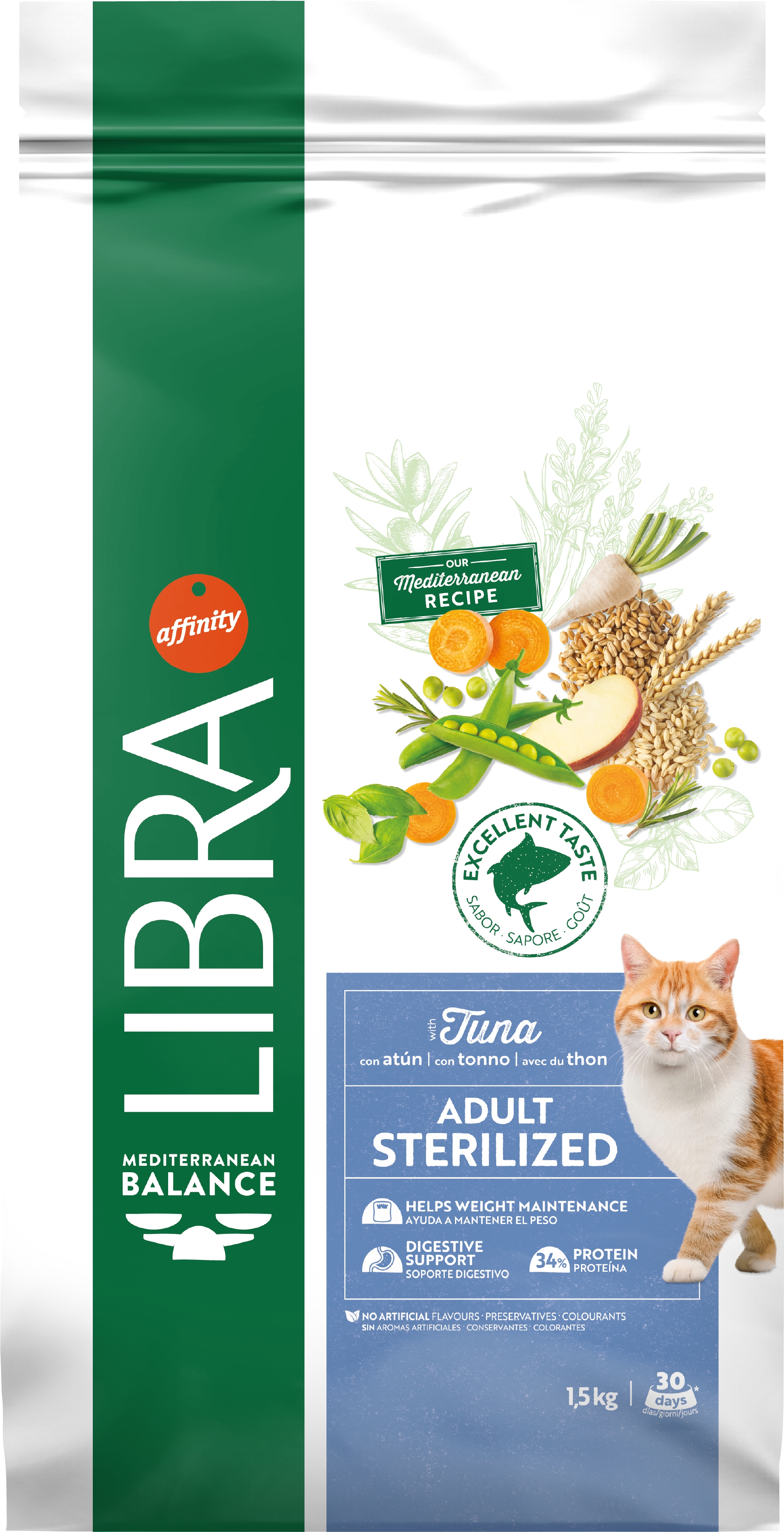 Cibo completo ed equilibrato per gatti adulti sterilizzati. Cereali (4% orzo), sottoprodotti di carne e animali, estratti proteici vegetali, prodotti per i prodotti di pesce e pesce (tonno del 10% disidratato), sottoprodotti di origine vegetale, oli e grassi, verdure, sostanze minerali. Taurine 700 mg, vitamina A 27000 IU, Vitamina D3 1800 Ui, Vitamina D3 1800 Ui, Vitamina E 95 mg, vitamina C, ferro 78 mg, iodio 1,31 mg, rame 8 mg, manganese 36,5 mg, zinco 80 mg, selenio 0,1 mg, Umidità 6%, Proteina 35%, grasso 11,7%, fibra bruta 5%, minerali 7,5%, calcio 1%, fosforo 0,8%, sodio 0,7%, potassio 0,8%, magnesio 0,14%, omega 3 0,22%, omega 6 1,5% , Energia metabolizzabile 3590 kcal / kg ? Nessun aroma artificiale, conservanti o coloranti. ? Controllo del peso ? Denti forti e ossa ? Digestione sana