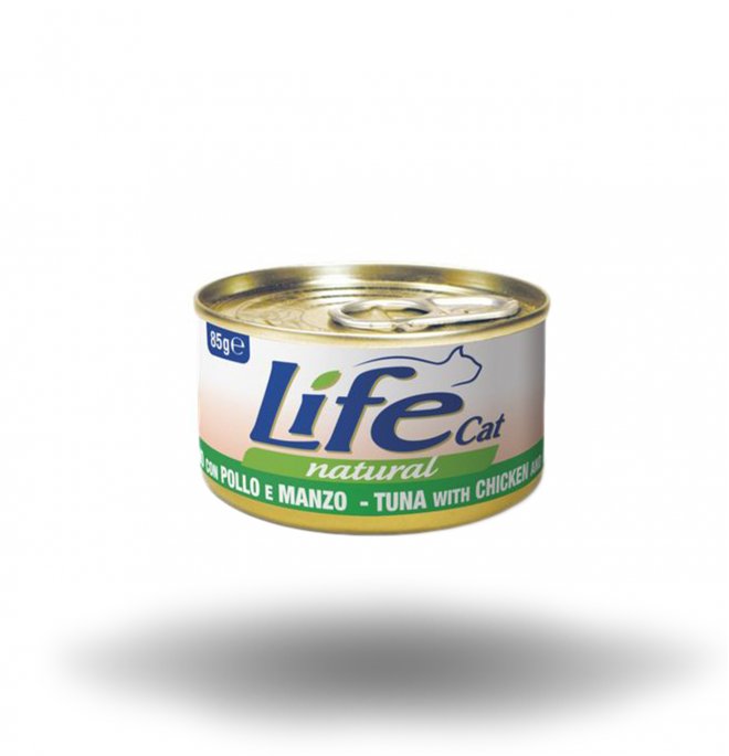 Trancetti di tonno di prima scelta presenti in grande quantità e guarniti con veri filetti di manzo e carne di pollo. Il tutto cotto al vapore e conservato in brodo di cottura. Il tonno e il manzo rendono l’alimento ricco di proteine nobili, di preziosi acidi grassi omega 3 e povero di carboidrati, nel rispetto delle esigenze nutrizionali del gatto.