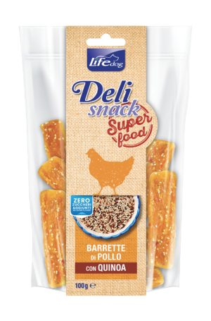 Delisnack Superfood barrette di pollo con quinoa è uno spuntino per cani con tanta carne e arricchito con quinoa, fonte di Aminoacidi essenziali, che fornisce al cane tanti micronutrienti di qualità. È uno snack privo di zuccheri aggiunti, senza coloranti ed aromi artificiali. Ideale come spuntino da dare al cane durante le passeggiate, gli allenamenti o come premio.