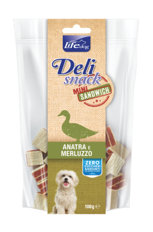 Delisnack Mini Sandwich di Anatra e merluzzo è uno spuntino con alte percentuali di pesce e carne, privo di zuccheri aggiunti, senza coloranti ed aromi artificiali. Questa composizione lo rende un prodotto sano e molto appetibile. Delisnack Mini Sandwich è l’ideale come spuntino per cani di piccola taglia, da dare al cane durante le passeggiate, gli allenamenti o come premio.