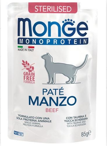 Monge Natural Superpremium Monoprotein* Gatto Sterilised Manzo è un alimento completo e bilanciato per i gatti adulti sterilizzati.Formulato con una singola fonte proteica animale, il manzo, e una singola fonte di carboidrati, le patate.Formulato inoltre con un ridotto apporto di grassi** e la fibra di piselli, fonte naturale di fibre insolubili, per favorire il mantenimento della forma fisica snella.