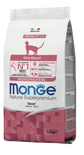 Monge Natural Superpremium Monoprotein* Gatto sterilizzato Manzo è un alimento completo e bilanciato per gatti adulti.Formulato appositamente per il tuo gatto adulto sterilizzato grazie alla presenza di un basso contenuto di grassi** per favorire il mantenimento del peso corporeo ideale e con L-Carnitina per il supporto della massa muscolare.*Formulato con un’unica fonte proteica animale (manzo), arricchita con Xilo-oligosaccaridi (XOS), prebiotici che supportano il benessere intestinale.Ingredienti ricercati, come la rosa canina, con componenti antiossidanti per poter contribuire a neutralizzare i radicali liberi e la yucca schidigera per il controllo degli odori intestinali, sono frutto della ricerca Made in Italy per supportare la qualità di vita dei nostri gatti.Senza coloranti e conservanti artificiali aggiunti.