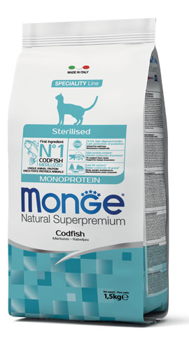Monge Natural Superpremium Monoprotein* Gatto sterilizzato Merluzzo è un alimento completo e bilanciato per gatti adulti.Formulato appositamente per il tuo gatto adulto sterilizzato grazie alla presenza di un basso contenuto di grassi ed elevato contenuto proteico** per favorire il mantenimento del peso corporeo ideale e supportare la massa muscolare.*Formulato con un’unica fonte proteica animale (merluzzo), arricchita con Xilo-oligosaccaridi (XOS), prebiotici che supportano il benessere intestinale.Ingredienti ricercati, come la rosa canina, con effetti antiossidanti per poter contribuire a neutralizzare i radicali liberi, e la yucca schidigera per il controllo degli odori intestinali, sono frutto della ricerca Made in Italy per supportare la qualità di vita dei nostri gatti.Senza coloranti e conservanti artificiali aggiunti.