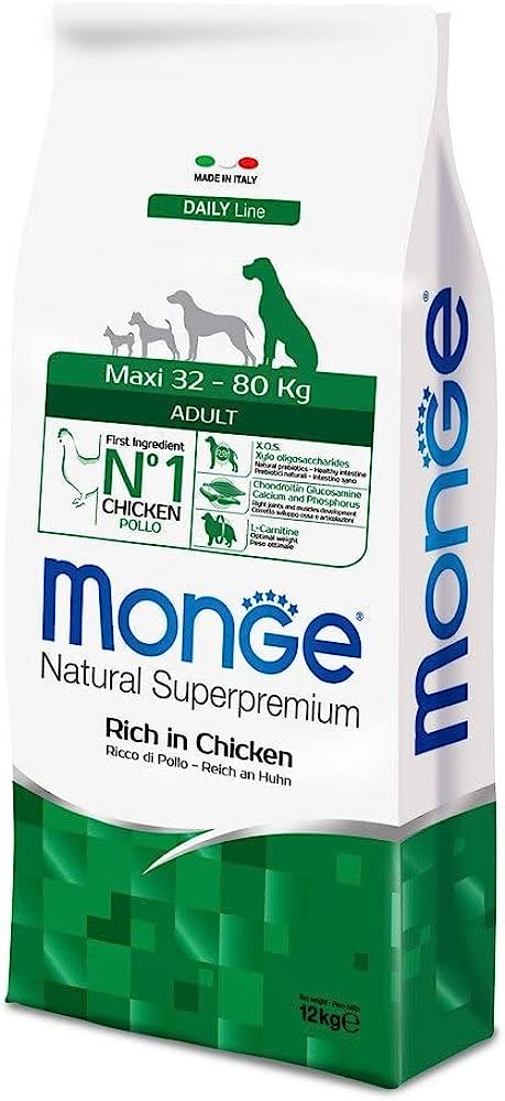 Monge Superpremium Adult Maxi è stato formulato per fornire ogni giorno all' organismo dei cani adulti appartenenti a razze di taglia grande con un peso compreso tra 32 - 80 kg tutti i nutrienti e i micronutrienti essenziali. Così si garantisce al cane una vita sana e attiva e il benessere del vostro quattro zampe di casa non può che aumentare.
