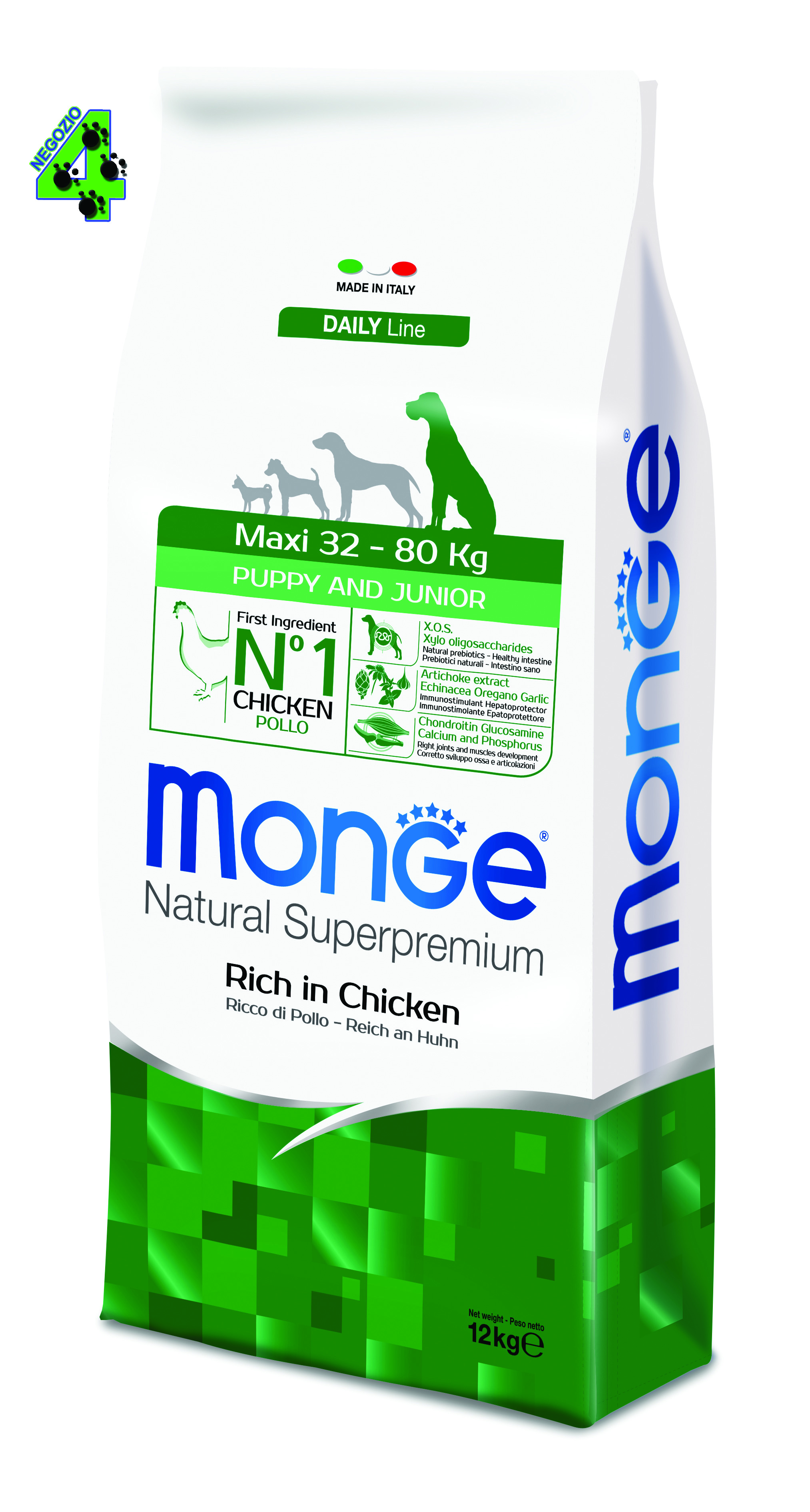 Monge Superpremium Puppy Junior Maxi è stato specificatamente studiato per i cani in crescita appartenenti a razze di taglia grande, che in età adulta raggiungono un peso di 32 %u2013 80 kg. A causa della loro taglia finale, questi cani crescono molto rapidamente e necessitano di nutrienti specifici che garantiscano uno sviluppo sano di tutte le funzioni vitali.