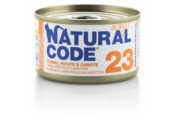 23 TONNO, PATATE E CAROTE Il tonno rappresenta la base di questo menù e costituisce un alimento molto appetibile per il gatto. Il tonno si caratterizza per l'elevato valore nutrizionale, sia per quanto riguarda la componente proteica che quella lipidica, per cui contribuisce a garantire lo stato di salute del gatto. L'integrazione con verdure, come le carote, aumenta l'apporto di fibra, utile per il benessere intestinale del gatto. La presenza di una piccola quantità di patate garantisce il completamento dell'apporto energetico della razione.La preparazione è in soluzione Jelly che migliora l'appetibilità e garantisce un valido apporto idrico. MATERIA PRIMA 100% NATURALE COMPOSIZIONE 44,71%TONNO 2,35% CAROTE 2,35% PATATE Alimento complementare per gatti adulti.Senza conservanti, coloranti e aromatizzanti.Materia prima 100% naturale. Senza glutine e senza cereali. Note: Acqua di cottura pari al 50,59% della ricetta. Additivi tecnologici: Gomma di cassia 1140 mg/Kg COMPONENTI ANALITICI Umidità 83,17% Proteina Grezza 12,82% Ceneri Grezze 0,83% Oli e Grassi Grezzi 0,37% Fibra Grezza 0,17% Energia (kcal/100gr) 57,26 RAZIONE GIORNALIERA RACCOMANDATA 2kg x1,0 4kg x2,0 6kg x3,0 PESO 85 gr %u212E Da consumarsi preferibilmente/Lotto/N. Identificativo stabilimento: Vedi informazioni sulla confezione.Da conservare in luogo fresco e asciutto.