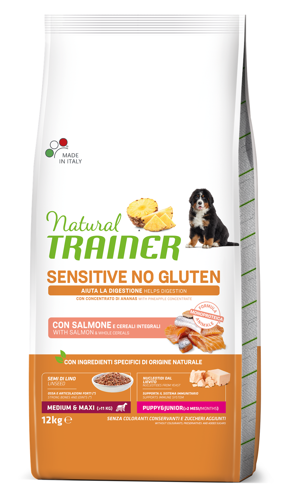 Natural Trainer Sensitive No Gluten Puppy & Junior Medium/Maxi soddisfa specificatamente le esigenze nutrizionali dei cuccioli e dei cani giovani di taglia grande e media. Contiene salmone come unica fonte di proteine animali e non racchiude componenti contenenti glutine. Quindi ? perfetto per cani con sensibilit? alimentare che soffrono di allergie e intolleranze.