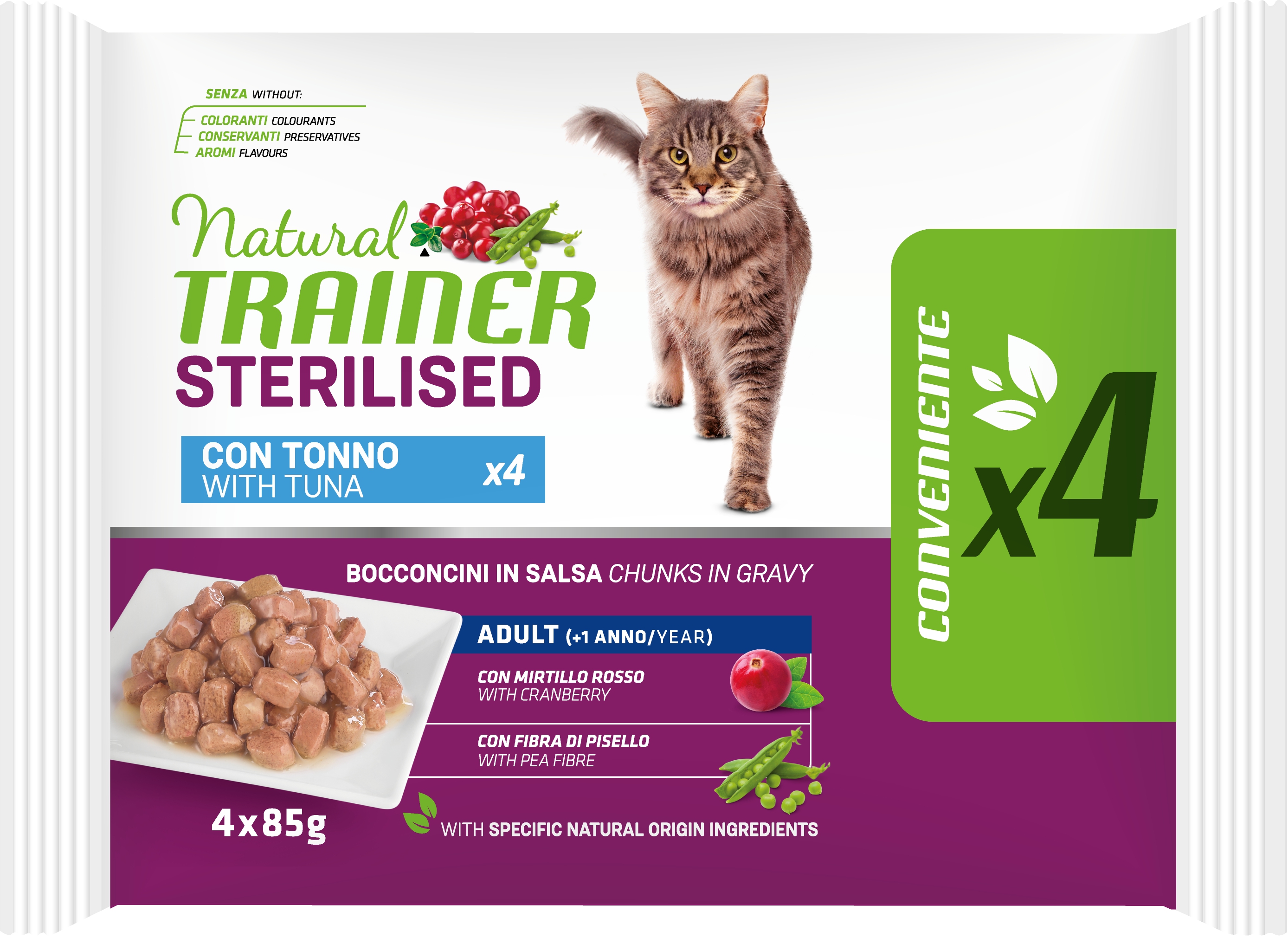 I bocconcini in salsa di Natural Trainer sono realizzati con estratto 100% naturale di mirtillo rosso per supportare l'apparato urinaria durante la vita adulta del tuo gatto. Multipack composto da: 12 buste da 85g al salmone 12 buste da 85g al pollo.