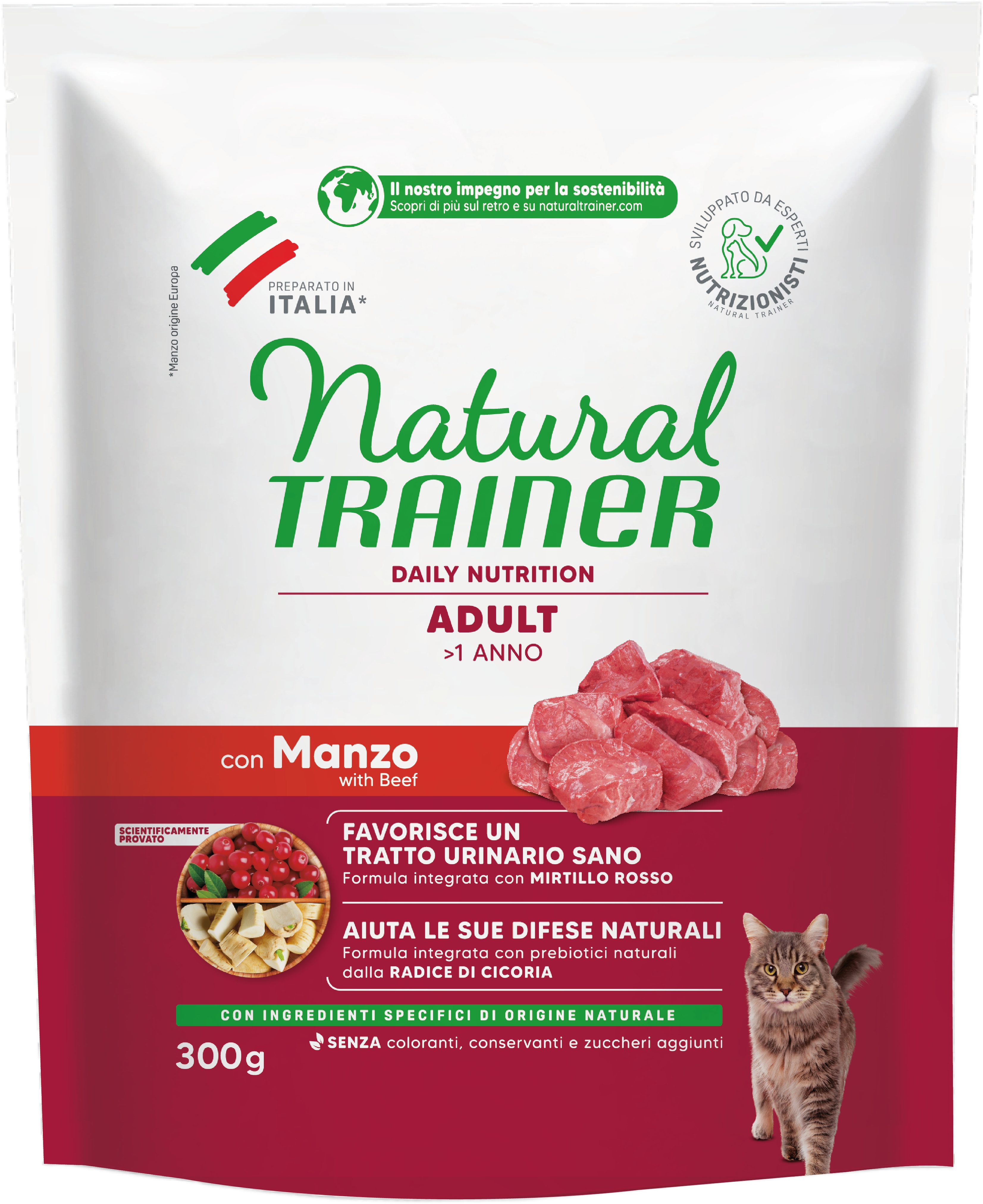 Crocchette Natural Trainer Adult con Manzo per gatti adulti, con componenti specifici naturali, estratto di mirtillo rosso, polpa di barbabietola, estratto di radice di cicoria, zinco e Omega 3 & 6
