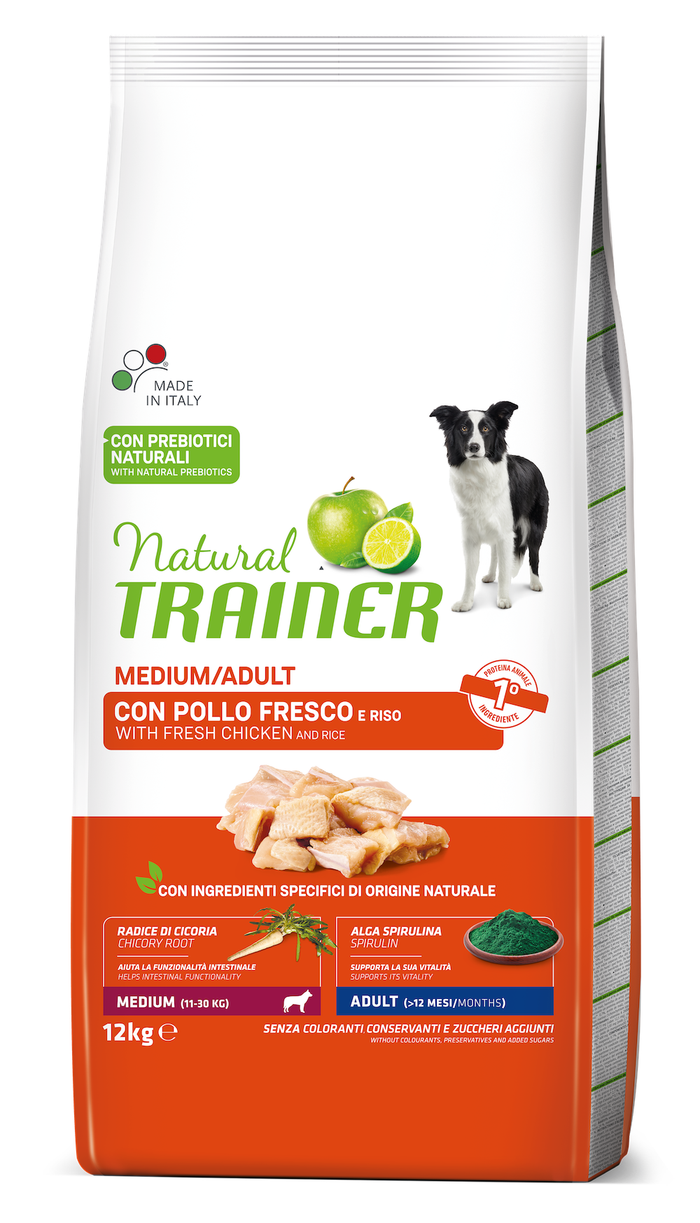 Ingredienti: Mais, carne disidratata di pollo e tacchino, riso 12%, carne fresca di pollo e tacchino 10% (di cui pollo 30%), strutto, proteine idrolizzate di pollo, polpe di barbabietola 2,3%, semi di lino, farina di pesce disidratato, cloruro di sodio, fibra di pisello, lievito di birra, carbonato di calcio, cozza verde (Perna canaliculus) 0,01%, alga spirulina (Arthrospira platensis) 0,005%, AppleZin%u2122 estratto secco di mela 0,0025%.