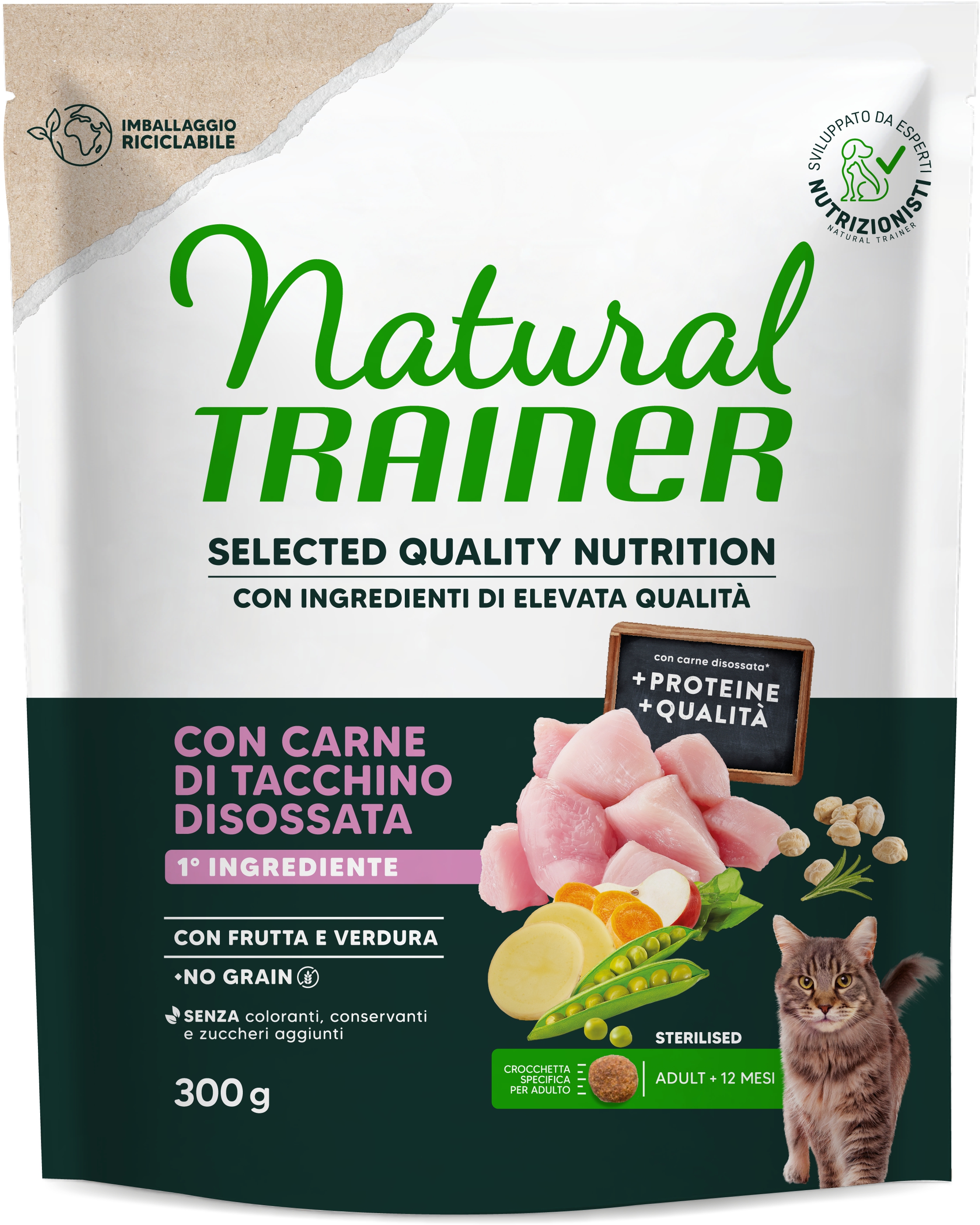Carni e derivati (35%, di cui 4% pollo), ortaggi (0,6% carota disidratata, pari al 3% di carota fresca, 0,5% piselli disidratati, pari all’1% di piselli freschi), sottoprodotti di origine vegetale (inulina di cicoria 0,1%), sostanze minerali, zucchero