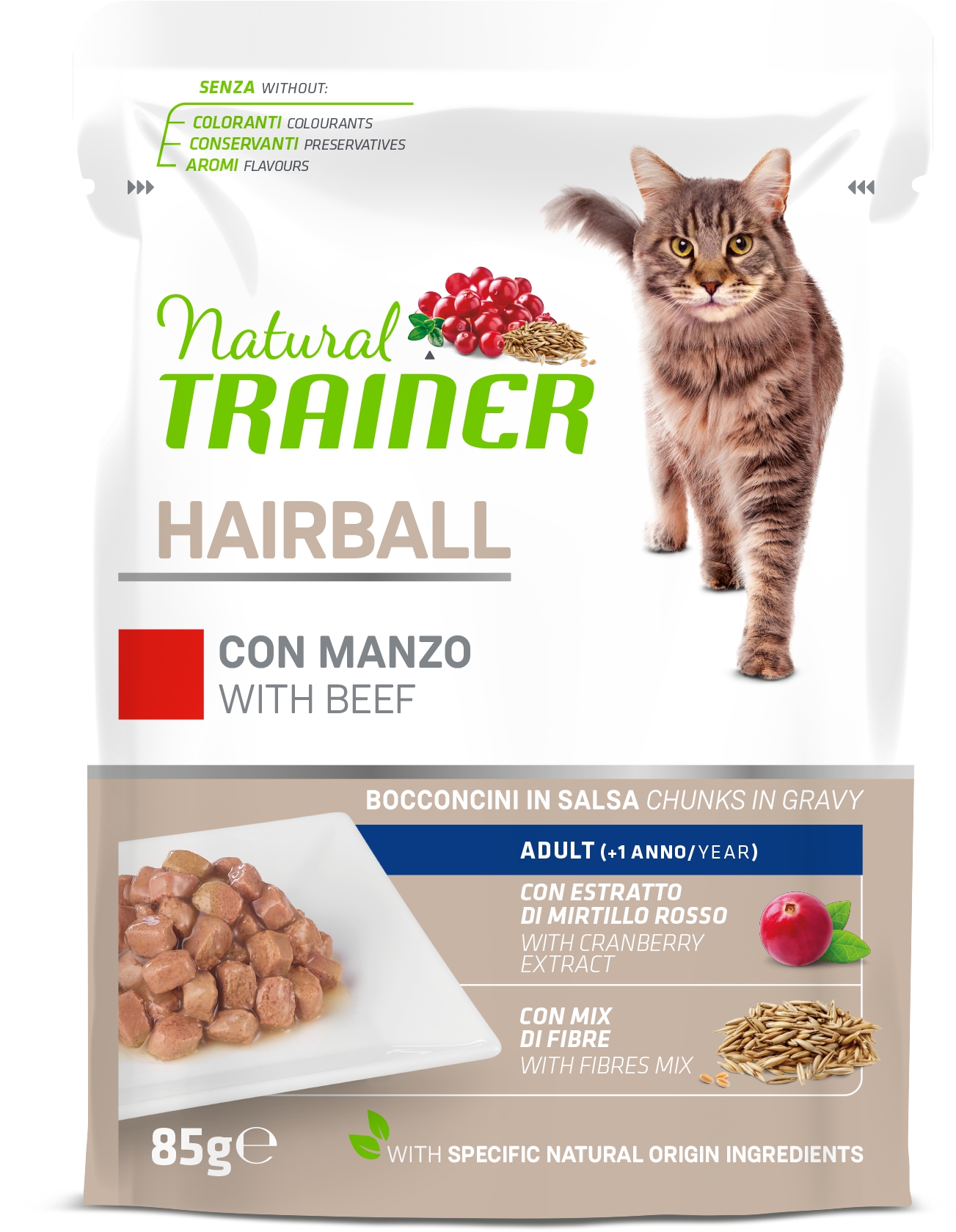 Natural Trainer Hairball Adult - Cibo Umido per Gatti con Manzo e Mix di Fibre - 12 buste x 85g