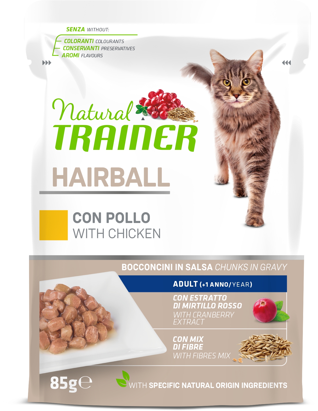 Natural Trainer Hairball Adult - Cibo Umido per Gatti con Pollo e Mix di Fibre - 12 buste x 85g