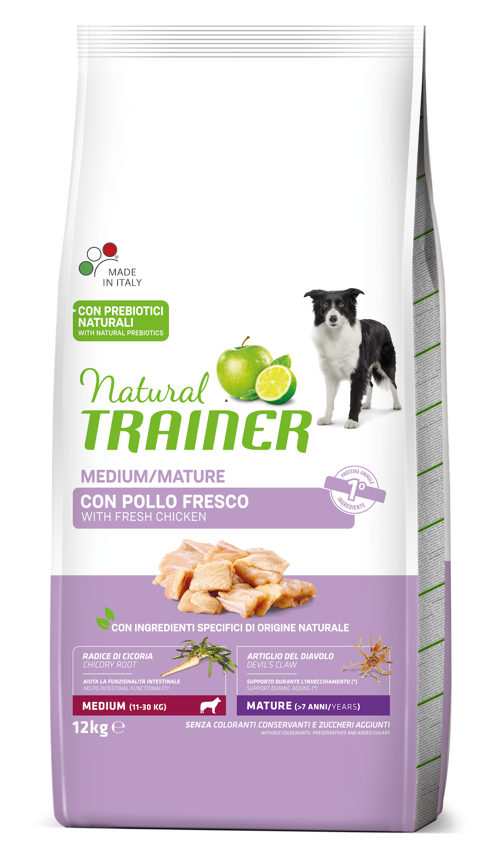Nova Foods Trainer Natural Medium Maturity Pollo Fresco è un alimento secco funzionale, in grado di soddisfare le specifiche esigenze nutrizionali dei cani anziani di taglia media (oltre i 7 anni).
