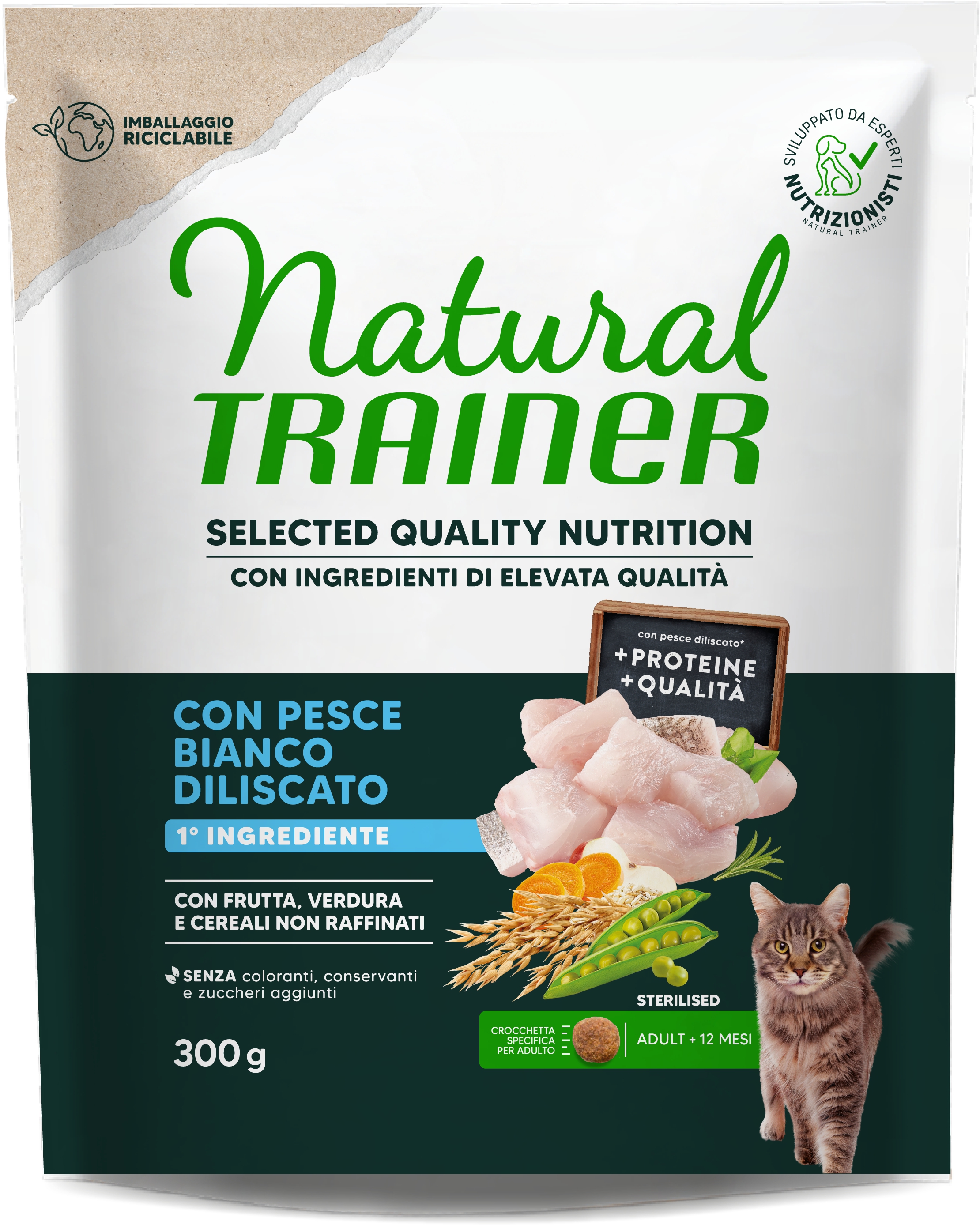 Natural Trainer Selected Quality Nutrition Gatto Healthy Grain Sterilised Pesce Bianco 300g