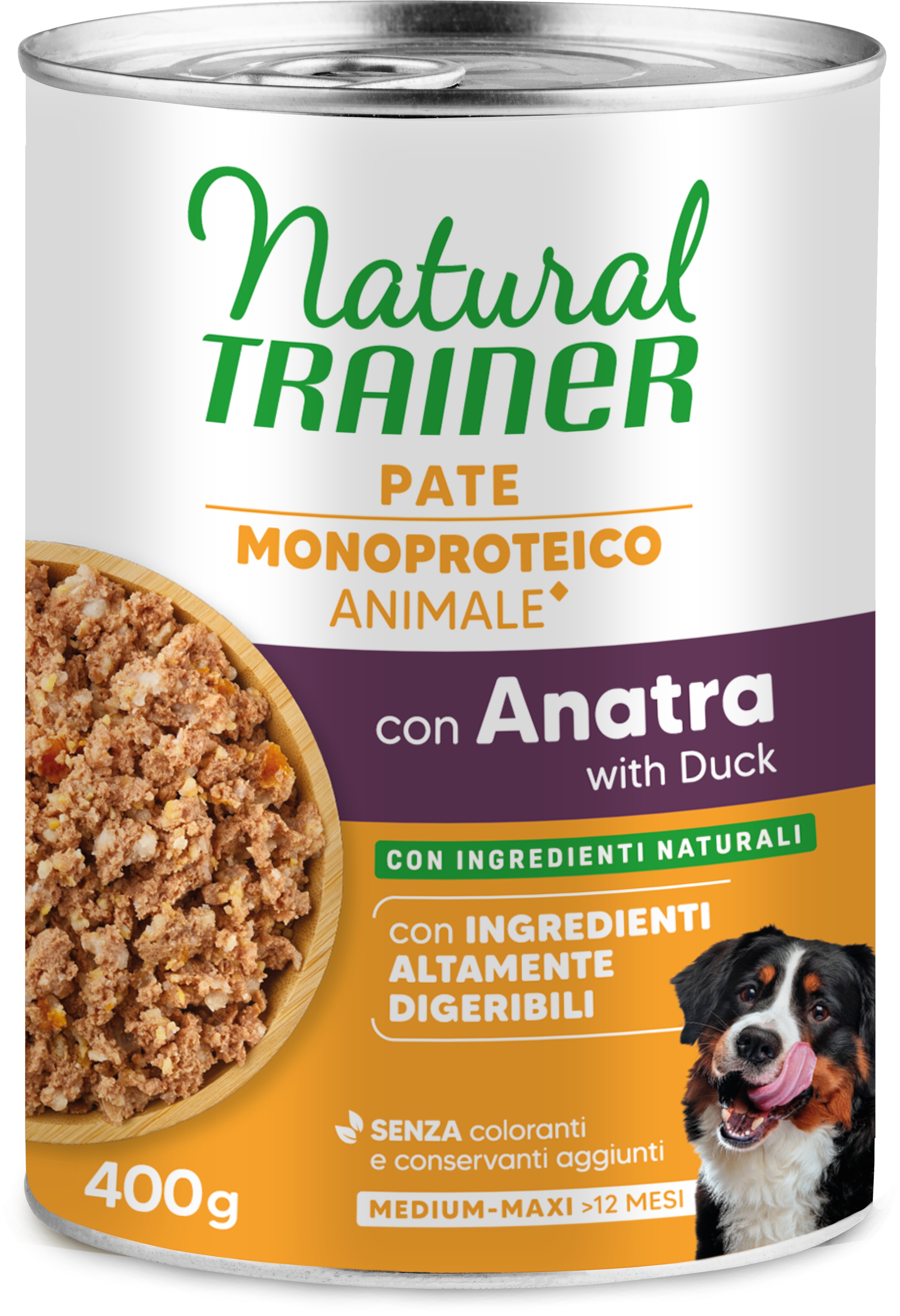 Umido senza glutine Natural Trainer Sensitive No Gluten Adult per cani medio-grandi, con 1 sola fonte proteica, cereali integrali e estratto di ananas 100% naturale.