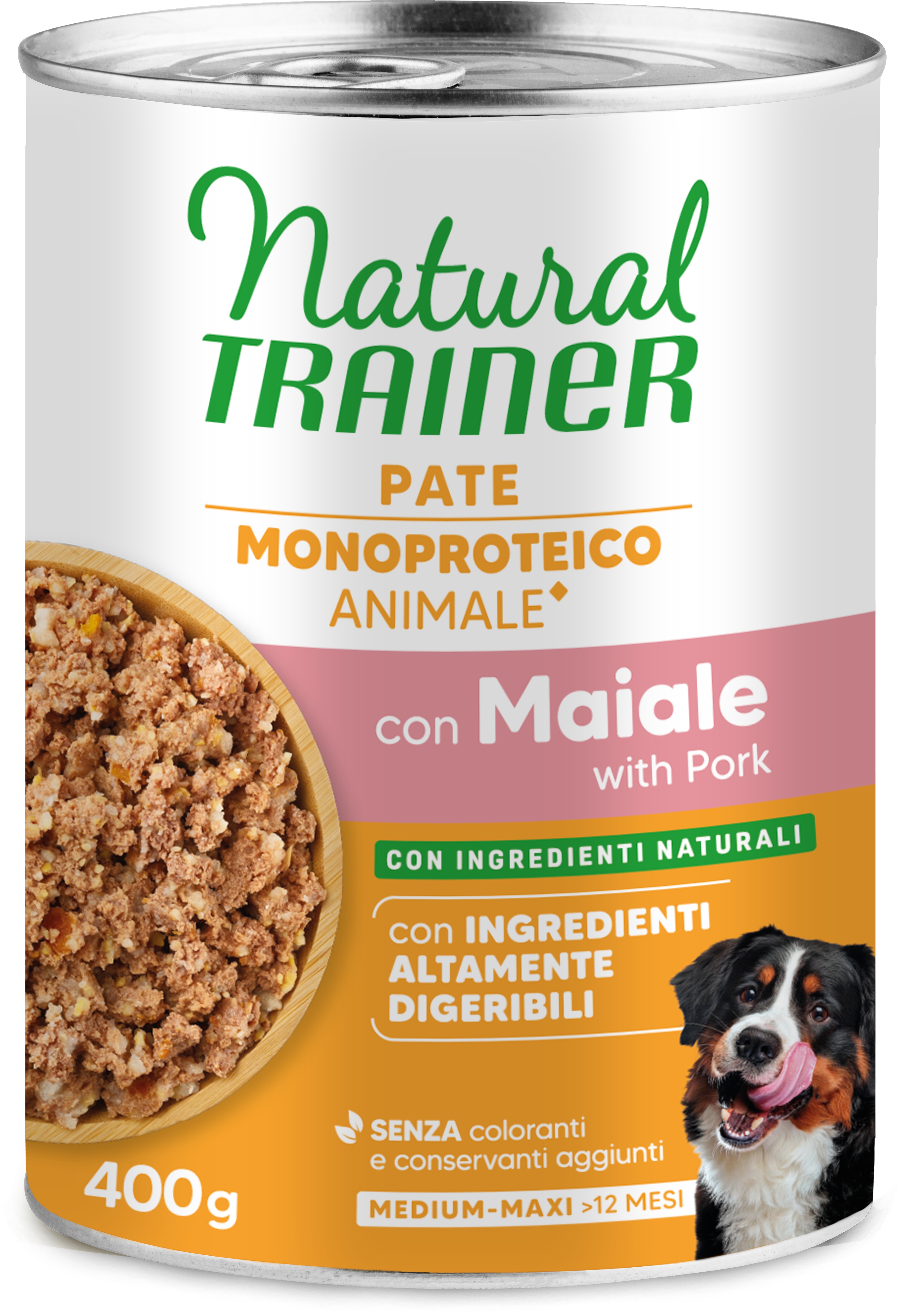 Umido senza glutine Natural Trainer Sensitive No Gluten Adult per cani medio-grandi, con 1 sola fonte proteica, cereali integrali e estratto di ananas 100% naturale.