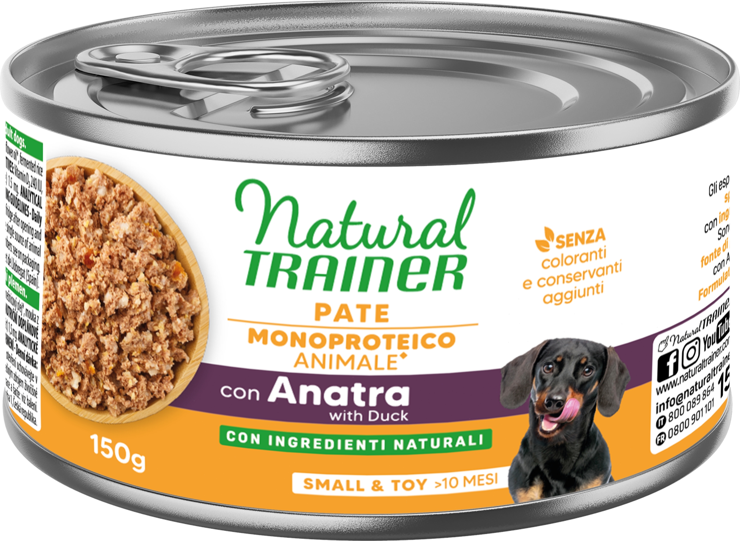 Alimento completo monoproteico per cani adulti di piccola taglia (meno di 10kg. di peso) da 1 a 8 anni di età. L’utilizzo di anatra come unica fonte proteica di origine animale e di cereali integrali come unica fonte di carboidrati, lo rende particolarmente indicato per soggetti predisposti alla sensibilità alimentare. È un alimento che non contiene glutine di frumento.