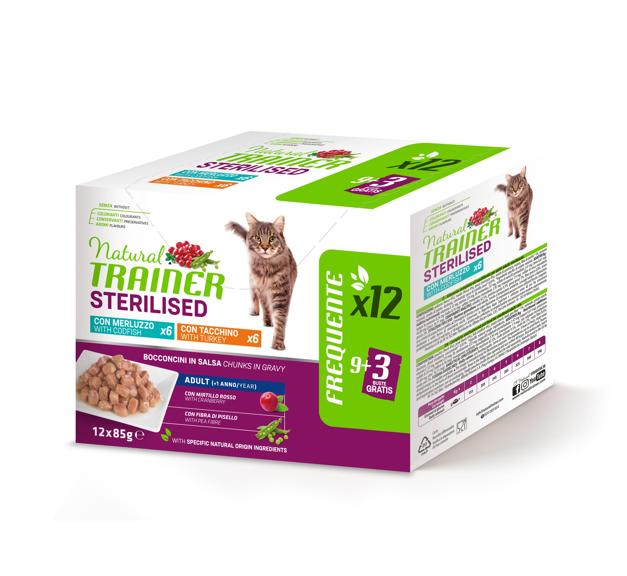 ll multipack Natural Trainer Sterilized è composto da ben 24 bustine da 85g in due varianti di gusto: merluzzo e tacchino. I gustosi bocconcini in salsa offrono al vostro micio la consistenza della pappa e parte dell'apporto giornaliero di liquidi, utili al corretto funzionamento delle vie urinarie.