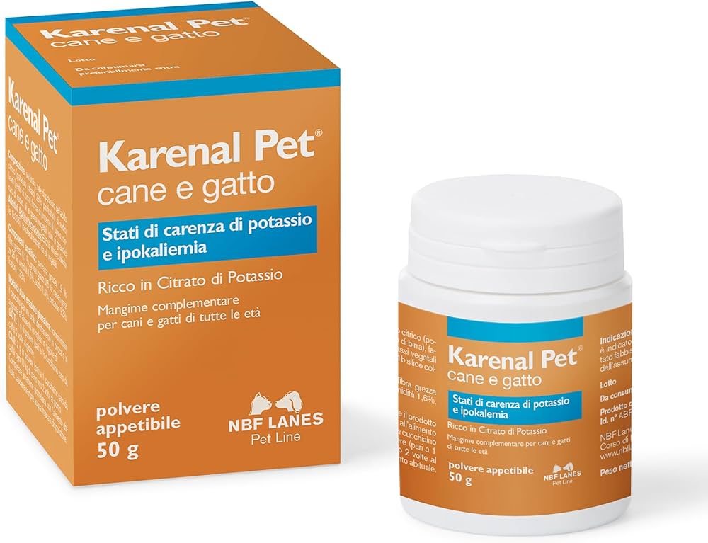KARENAL PET polvere ? un alimento complementare contenente citrato di potassio, a bassa concentrazione di fosforo, e ridotto tenore di proteine di elevata qualit?, per cani e gatti con particolari fini nutrizionali. L'apporto di citrato di potassio favorisce un'azione di recupero nel gatto quando si hanno situazioni carenziali di potassio come in caso di debolezza muscolare, dimagramento, inappetenza, andatura rigida e mantello opaco. Nel cane il citrato di potassio pu? essere utile nei casi di diarrea, vomito prolungato o come adiuvante in caso di acidosi metabolica da insufficienza renale cronica o da sforzo prolungato (cani da lavoro).